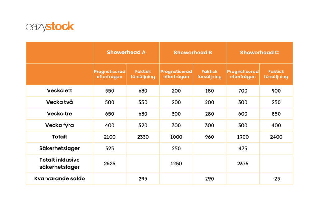 För artikeln Showerhead A är den faktiska försäljningen högre än den prognostiserade, men säkerhetslagret gör sitt jobb genom att tillhandahålla tillräckligt med lager för att täcka ökningen i efterfrågan med sina 295 artiklar i säkerhetslager kvar.