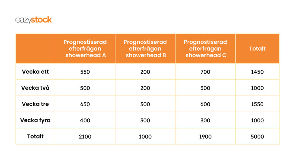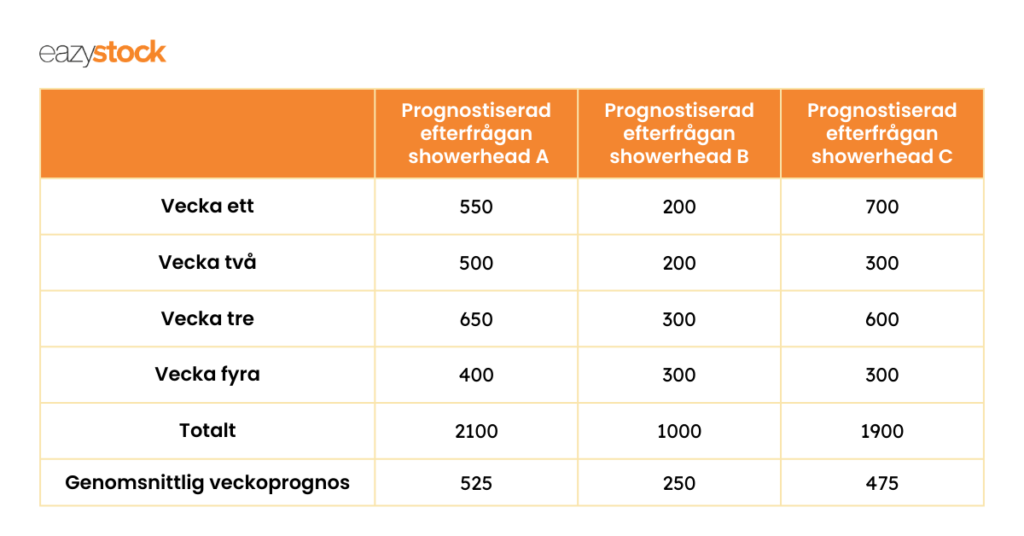 Om Mary istället beräknar säkerhetslagret utifrån snittförsäljningen per vecka under den senaste månaden, skulle hon sluta med 525 enheter i säkerhetslager av Showerhead A, 250 extra enheter av Showerhead B och 475 enheter av Showerhead C.